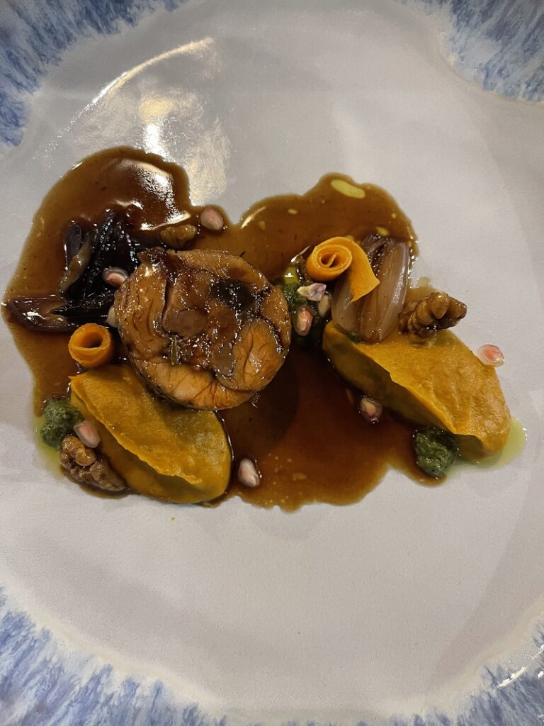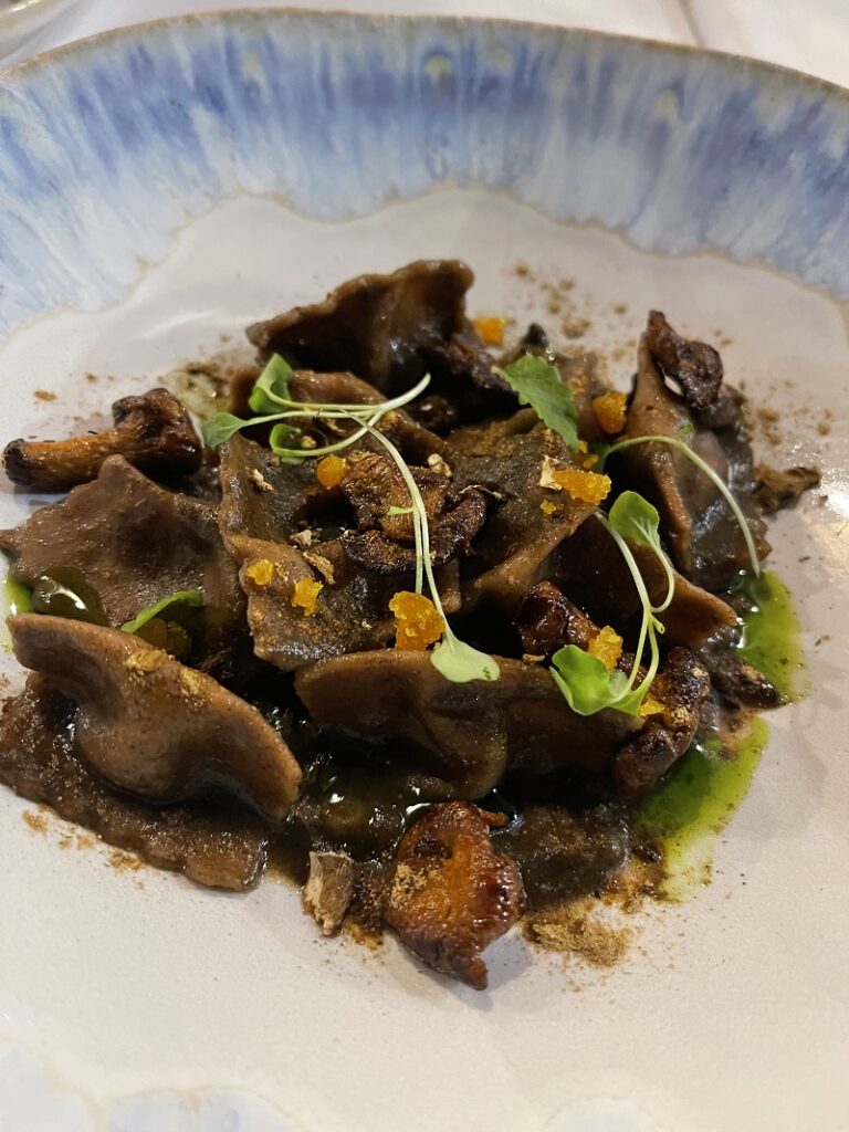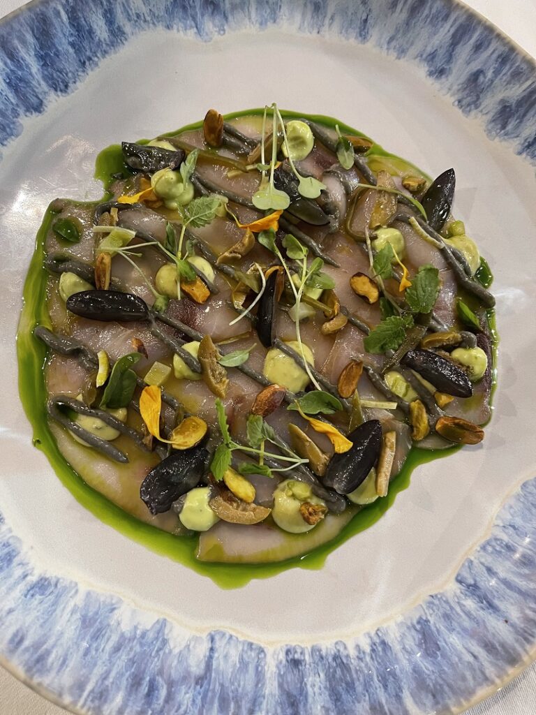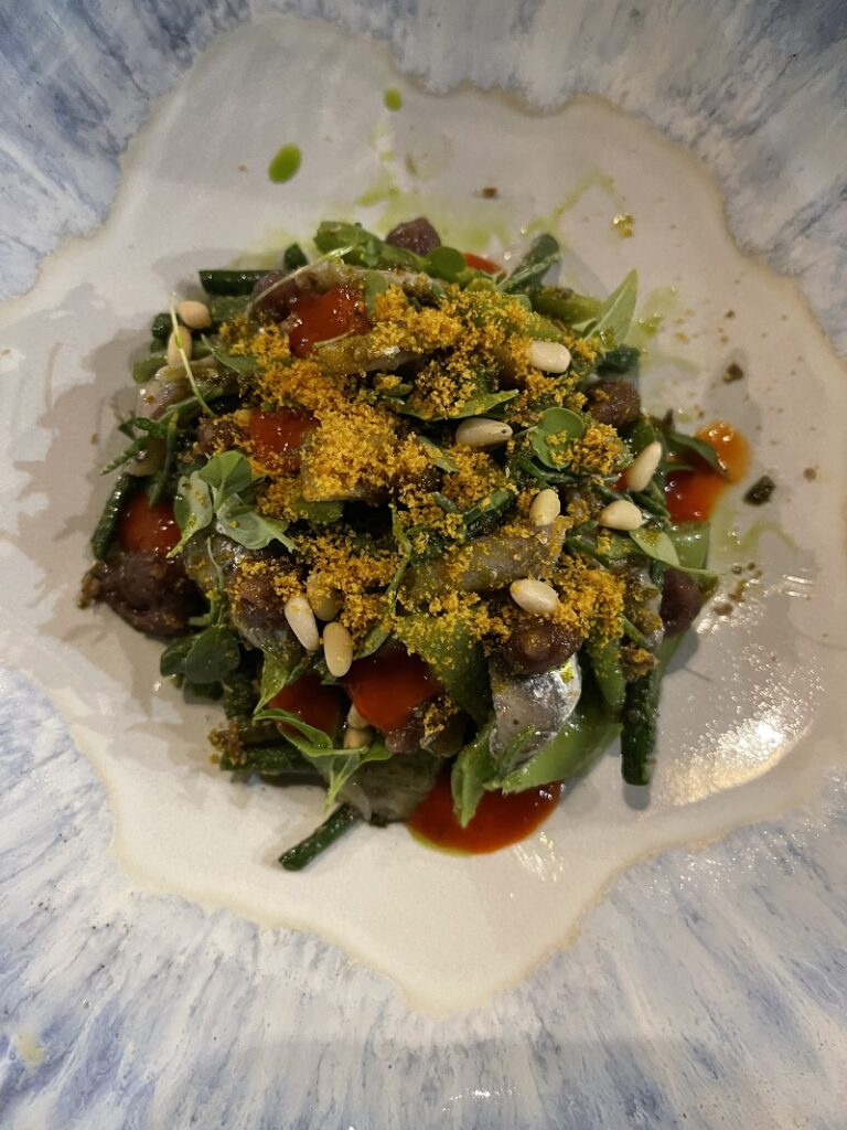 Ζήτησα μια ακόμα, τη σαλάτα Πρίγκιπα. Σε αυτή συνδυάζονταν με έξυπνο και ωραίο τρόπο τα φρέσκα φασόλια (ποικιλία από αυτά) με μαριναρισμένο γαύρο, τρίμμα αυγοτάραχο και καβουρδισμένα κουκουνάρια. Υλικά που ίσως όπως τα διαβάζετε να μην σας ταιριάζουν, όμως στο πιάτο μέσα έδεναν πολύ όμορφα μαζί. Δοκίμασα ακόμα τον μαριναρισμένο ξιφία με αγκινάρα τουρσί και σταφύλι, αλλά και τα γεμιστά της άλλης μέρας» που τα φτιάχνει με χυμό από καρπούζι και είναι απλά φανταστικά. Αντίθετα τα ραβιόλι, τα οποία ήταν γεμιστά με μανιτάρι και είχαν από πάνω τρίμμα αυγοτάραχο δεν ήταν ένα πιάτο που θα ζητούσα ξανά.