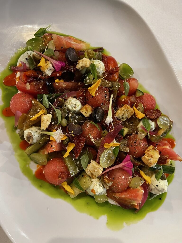 Το δείπνο δεν θα μπορούσε να μην ξεκινήσει με την διάσημη σαλάτα Καλοκαίρι, για την οποία όλοι μιλούν. Δεν είναι πάντα η ίδια, μιας και αλλάζει ανάλογα με το τι υπάρχει φρέσκο και τι είναι της εποχής, όπως μου εξήγησε ο Αριστοτέλης. Για παράδειγμα η δική μου είχε καρπούζι και ντομάτα πολλά φρέσκα μυρωδικά, πίκλες, ψητές πιπεριές, πικάντικο λευκό τυρί, γιαούρτι και αρκετό ελαιόλαδο – εξαιρετικό παρθένο φυσικά. Μια σαλάτα πληθωρική, που ξεχειλίζει από φρεσκάδα.