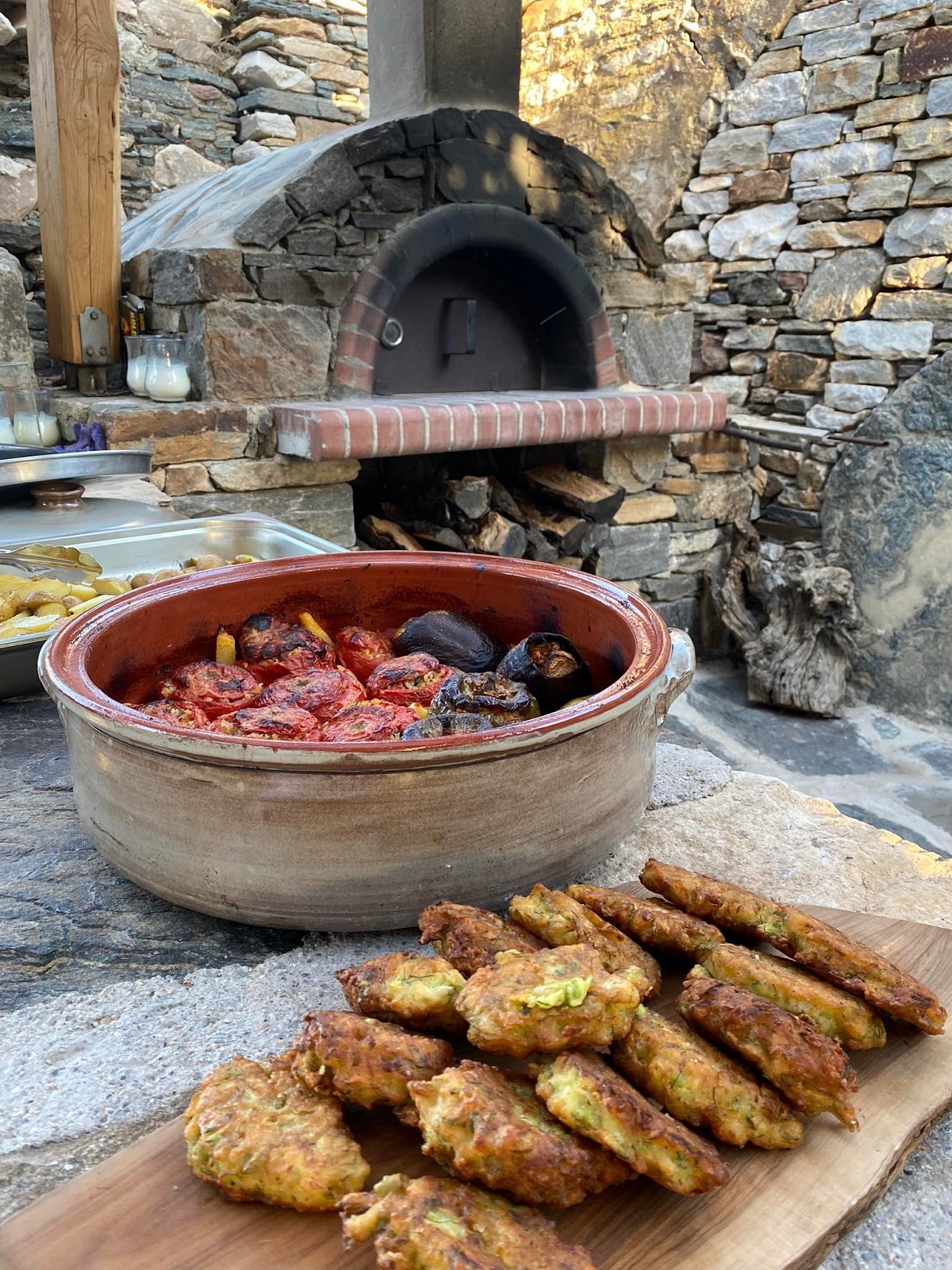 Στο φιλόξενο τραπέζι της πιο αξιοζήλευτης αυλής, τους κολοκυθοκεφτέδες διαδέχτηκαν οι ακόμη πιο νόστιμοι ντοματοκεφτέδες, που τηγανίζονταν μπροστά μας, στα ξύλα, από τα χέρια της κυρίας Ιουλίας. Ακολούθησαν τα γεμιστά της που άξιζαν ομολογουμένως βραβείο, κι έπειτα ήρθαν τα κρέατα από την αντικριστιέρα: κοντοσούβλι, κοτόπουλο και αρνί. Ο άντρας της, ο κ. Στάθης και ο γαμπρός της και έπαρχος του νησιού, Γιάννης Μαργαρίτης, είχαν φροντίσει να είναι ψημένα στην εντέλεια και να μας τα σερβίρουν με ταιριαστό ροζέ κρασί του κτήματος Γαία. Εν ολίγοις, κάναμε Πάσχα στο νησί, κι ας ήταν κατακαλόκαιρο στα μέσα του Ιούλη!