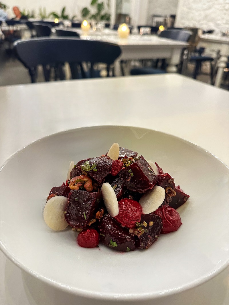 Η γνωριμία μου με τις γεύσεις του εστιατορίου ξεκίνησε με δύο ορεκτικά: το δροσερό και όμορφα όξινο ceviche μαγιάτικο με φινόκιο, αυγοτάραχο, σάλτσα εσπεριδοειδών και πορτοκάλι, και το πιο πληθωρικό καρπάτσιο τσιπούρας με ψητό αγγούρι, σάλτσα σόγιας και κρίταμο. Η σαλάτα παντζάρι με πέστο παντζαριού, καρύδια και καψαλισμένο ψωμί ξεχώρισε για τις ωραίες υφές και την κομψά γλυκιά της γεύση ενώ στις νέες αφίξεις εντύπωση μου έκαναν οι ντοματοκεφτέδες με τη χρυσαφένια κρούστα τους -που συνοδεύονταν από κρύα σάλτσα ντομάτας και κρέμα φέτας- καθώς και οι πιο παραδοσιακές γαρίδες σαγανάκι με πλούσια πικάντικη σάλτσα ντομάτας και φέτα.