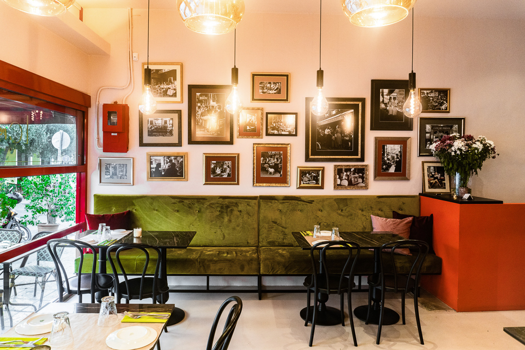 Αφού πέρασαν τόσοι μήνες, όμως, απαλλαγμένη πια κι από την αγωνία τού «μπήκα πρώτη», ένα βράδυ Παρασκευής, αρκετά νωρίς για τα δεδομένα της γειτονιάς, βρέθηκα στον εντελώς ανανεωμένο χώρο του που παραπέμπει ευθέως σε παριζιάνικο καφέ. Παντού επικρατεί εκείνο το ζωηρό κόκκινο χρώμα, που κάνει έντονο κοντράστ με τις πράσινες πλεκτές καρέκλες και τα μαύρα λιτά τραπέζια. Ακόμα και το όνομα του εστιατορίου χαραγμένο με art deco, χρυσαφί γραμματοσειρά στο τζάμι του παραθύρου- «καρμανιόλα», που τέτοια εποχή ανοίγει συρόμενo κατακόρυφα, θυμίζει Παρίσι.