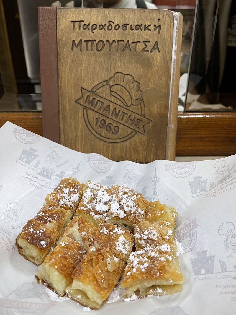 Εκτός από τα 21 χλμ. του αγώνα έκανα και άλλα τόσα, φέρνοντας βόλτα τη πόλη. Όχι μόνο για να δω τι καινούργιο έχει ανοίξει αλλά και να επισκεφτώ παλιά και αγαπημένα στέκια. Όπως για παράδειγμα τον Μπαντή (Παναγιάς Φανερωμένης 33, τηλ. 2310 510 355) που φτιάχνει τις πιο νόστιμες μπουγάτσες. Και όταν λέω μπουγάτσες δεν αναφέρομαι μόνο στη γλυκιά εκδοχή που ξέρουμε εμείς εδώ κάτω στην Αθήνα, αλλά στο αέρινο φύλλο, το οποίο γεμίζουν με τυρί, με κιμά, με κρέμα και με ό,τι μπορεί κανείς να φανταστεί. Η επίσκεψη στον Μπαντή είναι κάτι σαν υποχρεωτική. Και πάντα η ίδια παραγγελία: μια με τυρί και με κρέμα με χιόνι (άχνη ζάχαρη δηλαδή) και ελάχιστα σκουριά (κανέλα).