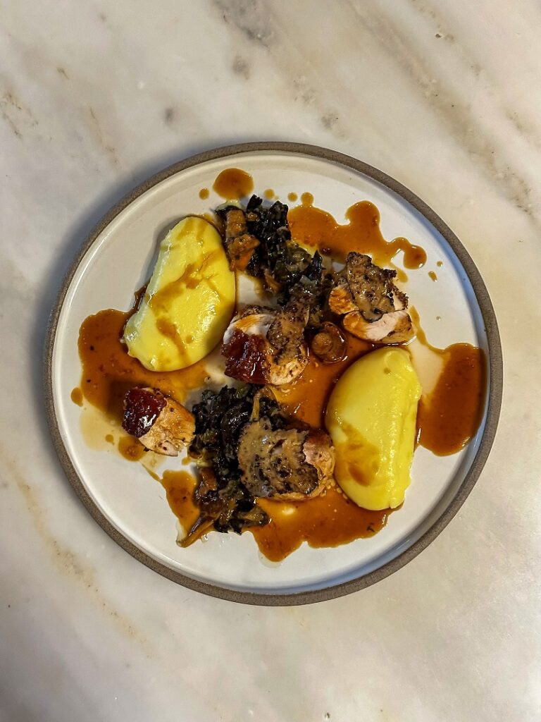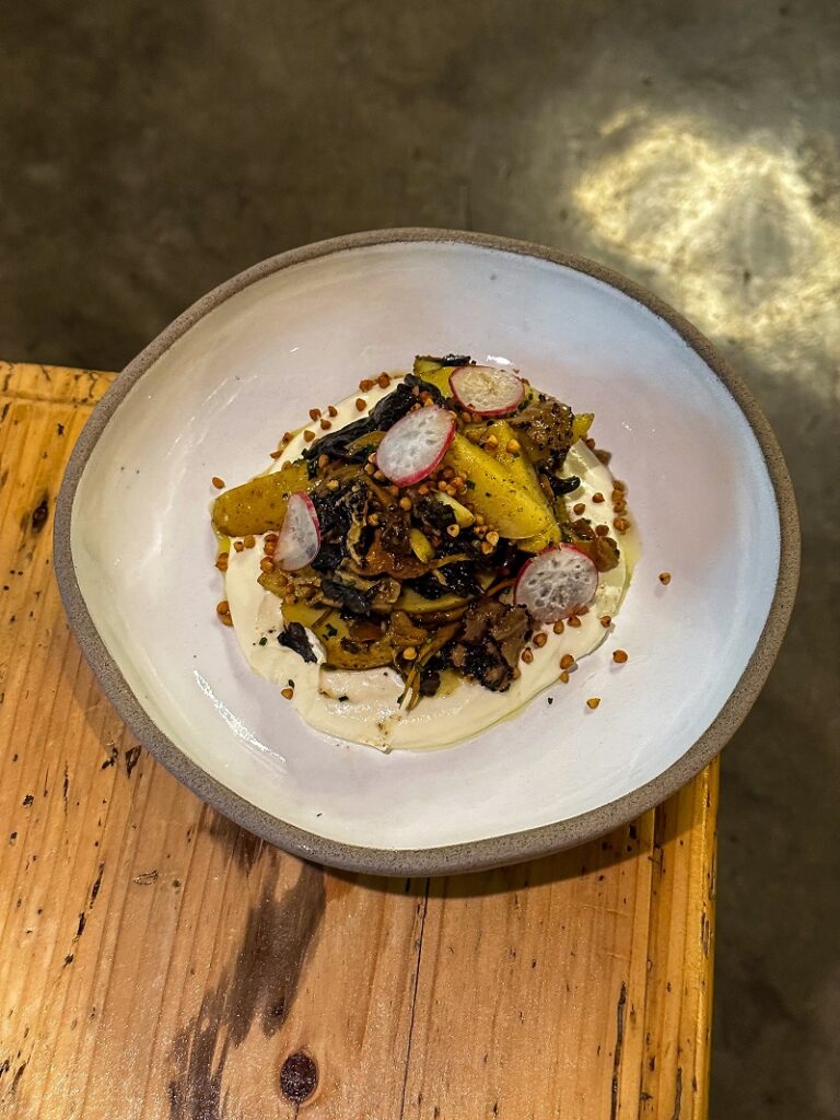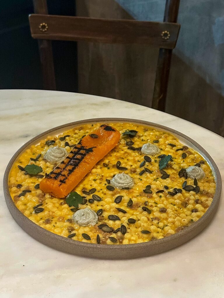 Από όσα δοκίμασα την ημέρα της επίσκεψής μου ξεχώρισα την πατατοσαλάτα με μανιτάρια εποχής – ανάμεσά τους, χρυσή τρομπέτα, μαύρη τρομπέτα και κανθαρέλες – καρπάτσιο τρούφας, τραγανό φαγόπυρο, ραπανάκι και βελούδινη κρέμα καπνιστών τυριών, την τάρτα σπετσοφάι με κρέμα φασολάδας, λουκάνικο, πιπεριές, τοματίνια κονφί και ξινό Ίου και το φιλέτο από στήθος κοτόπουλου, μαριναρισμένο σε μουστάρδα Dijon και συνοδευόμενο από πουρέ καπνιστής πατάτας, ραγού μανιταριών και σάλτσα ρίγανης. Ενδιαφέρουσα ήταν και η ωραία χυλωμένη fregola με κρέμα κολοκύθας, ψητή κολοκύθα, κολοκυθόσπορους και κυανό τυρί, η οποία, με την αφαίρεση του τυριού, γίνεται μια καλή vegan επιλογή.
