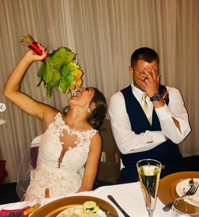 Το περιστατικό συνέβη σε γάμο στην Αμερική και τις φωτογραφίες δημοσίευσε στον λογαριασμό της στο Instagram η παράνυμφος και ξαδέρφη της νύφης. Μάλιστα, ήταν εκείνη και όχι ο γαμπρός που προσέφερε στη νύφη αυτή την περίεργη ανθοδέσμη, κάνοντας της έκπληξη.