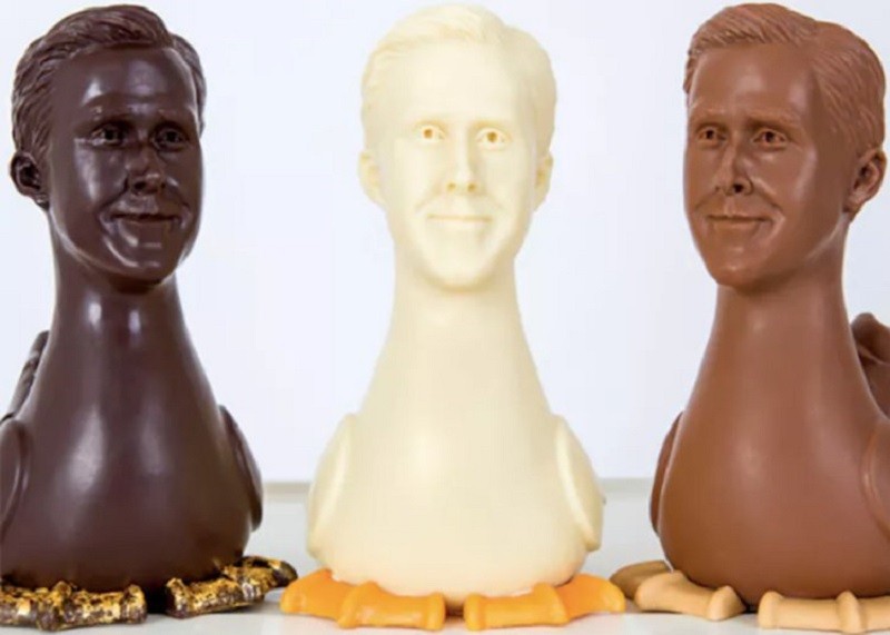 Για το πρόσωπο του Ryan Gosling πάλι προτίμησαν ένα χηνάκι, πάλι σε τρεις διαφορετικές εκδοχές -με σοκολάτα γάλακτος, μαύρη και λευκή. Οφείλουμε να παραδεχτούμε βέβαια ότι η δική του εκδοχή μας φαίνεται λιγότερο επιτυχημένη, αν και δεν θα λέγαμε όχι αν κάποιος ήθελε να μας τα προσφέρει το φετινό Πάσχα.