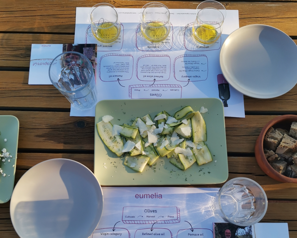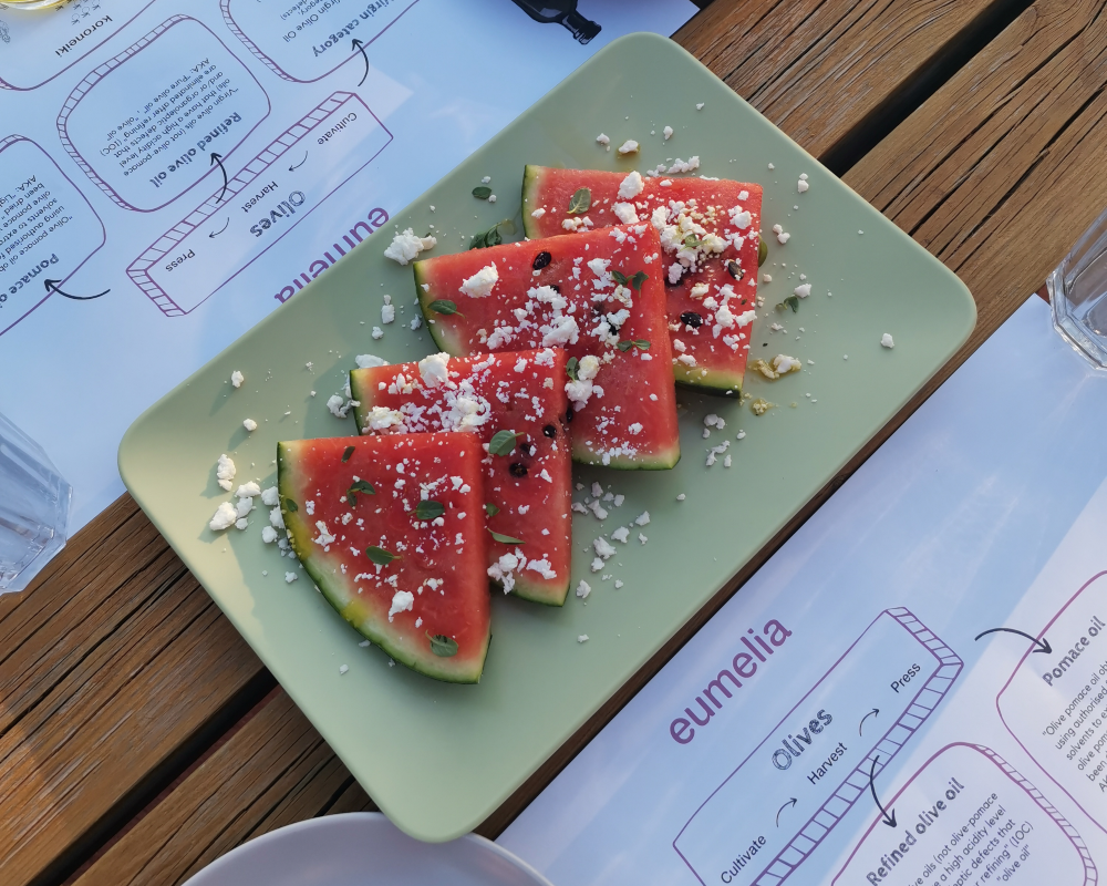 Ευμέλια σημαίνει αρμονία. Πράγματι, τίποτα δεν διαταράσσει την ηρεμία που γεννά ο χώρος. Στην Eumelia μπορείτε να μείνετε – το κατάλυμα διαθέτει εξαιρετικά ξύλινα σπιτάκια με χρώμα και θέα, ιδανικά για ξεκούραση και αποσυμφόρηση από τους φρενήρεις ρυθμούς της καθημερινότητας. Η τεραστίων διαστάσεων και πλούσια σε ζώα φάρμα προσφέρεται και για ξεναγήσεις από τους ευγενέστατους ιδιοκτήτες της δίπλα ακριβώς από τα αλόγα, τις πάπιες και τις χήνες. Φυσικά, η Eumelia αποτελεί εξαιρετική στάση για γαστρονομία καλού ελαιόλαδου, με ανάλαφρη υφή, ήπια επίγευση και μεστή αίσθηση στον ουρανίσκο ή olive pairing με φρέσκα φρούτα και λαχανικά, όπως καρπούζι με φέτα, κολοκυθάκι με εσάνς λεμονιού και ελαιόλαδου, σαλάτα σεβίτσε με πρώτες ύλες από την καλλιέργεια που απέχει μερικά βήματα από το τραπέζι, σπιτικές πίτες – η επιλογή αναδιαμορφώνεται διαρκώς ανάλογα με την εποχικότητα του πρωταγωνιστικού υλικού – αλλά και μους σοκολάτας με ελαιόλαδο. Στην πράξη, είναι η ιδανική στάση για ένα αγροτουριστικό διάλειμμα και γνωριμία με έναν διαφορετικό τρόπο ζωής και γαστρονομίας. Η Ελληνική γεύση και οι Γούβες Λακωνίας στα καλύτερα τους!
