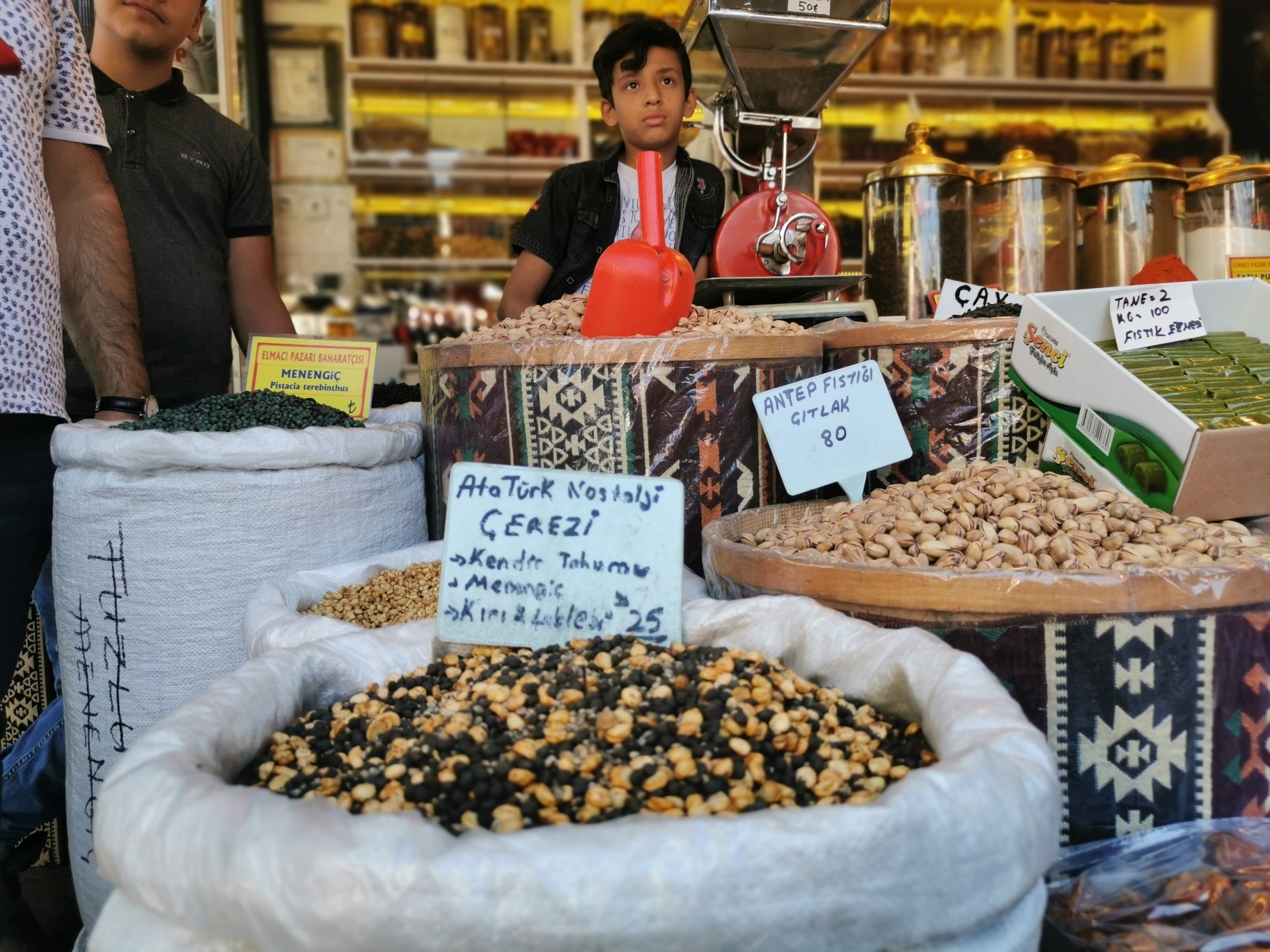 Στην κλειστή αγορά -και τους γύρω δρόµους- που ανοίγει λίγο αργά, κλείνει το βράδυ και λειτουργεί τις Κυριακές θα βρείτε τα πάντα. Μικρά βουνά µπαχαρικών, µείγµατα µοναδικά µε συνταγές κρυφές του κάθε µαγαζάτορα, αποξηραµένα λαχανικά σε µεγάλες αρµαθιές, λεµπλεµπιά –τα στραγάλια στα τουρκικά- αφράτα και τραγανά, βότανα για κάθε χρήση φτιάχνουν ένα καλειδοσκοπικό τοπίο που µοιάζει να σε καταπίνει µε το πρώτο βήµα που θα κάνεις προς τα εκεί.