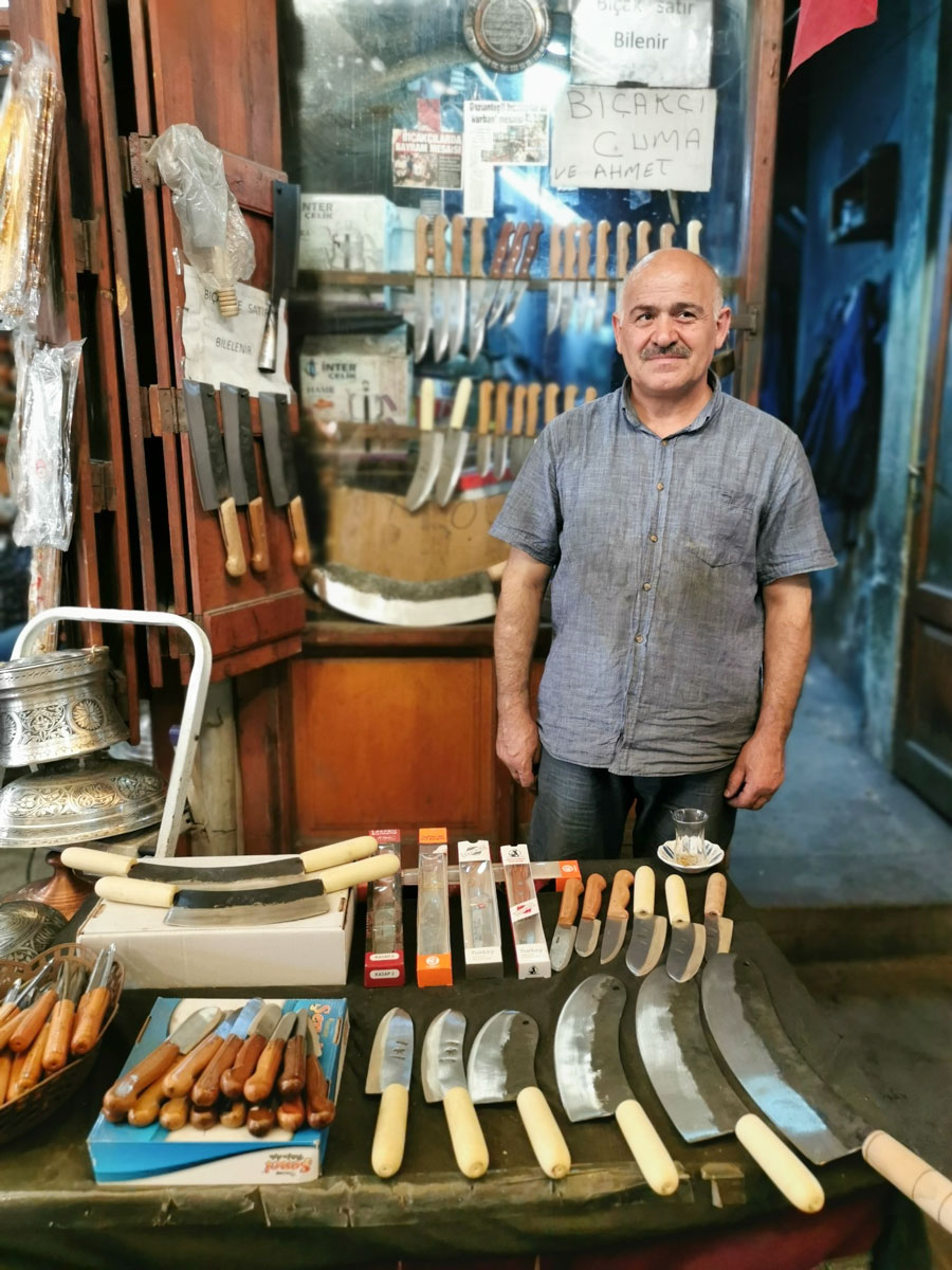 Οι µαχαιράδες είναι απαραίτητοι στην καθηµερινότητά τους. Χειροποίητες κάµες, σφυρηλατηµένο ατσάλι ψηµένο στη φωτιά, που ακονίζεται και µετατρέπεται σε τεράστιες µετζαλούνες για το κόψιµο του κιµά, σε µπαλταδάκια, µαχαίρια κουζίνας και άλλα για τα χασάπικα. Διάσηµοι για την τέχνη τους στον χαλκό, οι µπακιρτζήδες παραµένουν ενεργοί, σκαλίζουν µοτίβα κλασικά και άλλα κατά παραγγελία σε σκεύη χρηστικά και διακοσµητικά. Κάθονται σε µικρά χαµηλά σκαµνιά στην είσοδο του µαγαζιού και εργάζονται σκυφτοί.
