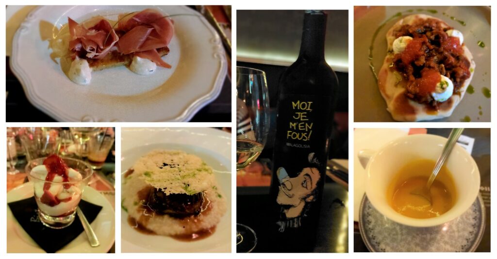 Μας υποδέχτηκε ο σεφ του εστιατορίου, ο Απόστολος Στεργιόπουλος. Σε έναν χώρο με πολύ όμορφη διακόσμηση και εξαιρετική ατμόσφαιρα, απολαύσαμε τις δημιουργίες του, τις οποίες πάντρεψε με οινικές επιλογές από το τοπικό Οινοποιείο του Καραμήτρου. Ξεκινήσαμε με μια πραγματικά πεντανόστιμη βελουτέ από καρότο, με κενέλ γιαουρτιού αρωματισμένο με πορτοκάλι. Το ταίριαξε με το λευκό Je m’en fous. Ωραίο και το σερβίρισμα σε φλιτζάνι τσαγιού: σου έδινε την επιλογή είτε να το πιεις ως… ρόφημα είτε να το φας με το κουταλάκι του γλυκού. Στη συνέχεια, το κόκκινο κρασί Je m’en fou το ταίριαξε με μια «πειραγμένη» μπατζίνα, με προσούτο, αγριοράπανο, γιαούρτι και σχοινόπρασο. Ο συνδυασμός όλων των υλικών σε μια μπουκιά έδιναν στο πιάτο μια εξαιρετική νοστιμιά. Το καθένα ξεχωριστά δεν με ενθουσίασε. Το επόμενο πιάτο ήταν μια χειροποίητη πίτα ψωμιού, με κιμά, κρέμα φέτας και λίγη οξύτητα από μαρμελάδα ντομάτα. Πολύ νόστιμο πιάτο. Στη συνέχεια μας σέρβιραν μοσχαρίσια μάγουλα με τραχανά, λάδι από μαϊντανό και μπισκότο παρμεζάνας, το οποίο μας συνέστησαν να σπάσουμε πριν το καταναλώσουμε. Τέλος για γλυκό, ο σεφ επέλεξε μια πιο τολμηρή επιλογή: αντί για γλυκό κρασί, θέλησε να ταιριάξει την πάβλοβα με ένα ροζέ ημίξηρο, πολύ αρωματικό κρασί. Οι περισσότεροι συνδαιτημόνες διαφώνησαν με αυτό. Ωστόσο, για εμένα ήταν το πιο ενδιαφέρον οινικό πάντρεμα στο συγκεκριμένο μενού, καθώς η οξύτητα που έβγαζε η πάβλοβα -που ήταν γλυκιά τόσο όσο- ταίριαζε υπέροχα με ένα ημίξηρο κρασί.