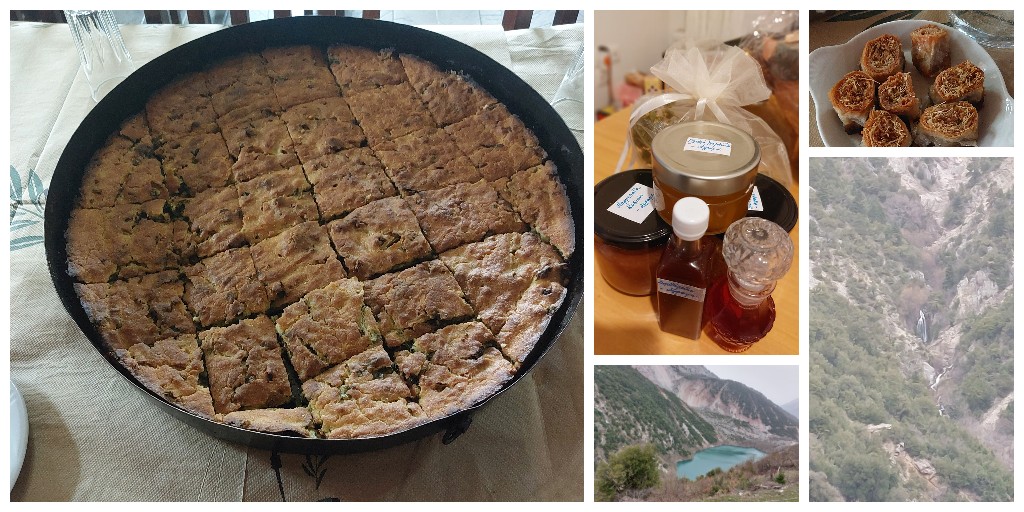 Η Κα Ιφιγένεια στο χωριό Πετρίλο, στο Διάσελο, μαγείρεψε για εμάς παραδοσιακές τοπικές συνταγές. Αυτό που ξεχώρισα είναι ο δικός της πλαστός: ένα… διακριτικό ταψί για να ταΐσει όλη την παρέα. Επίσης, πέρα από το φαγητό και τη ζεστή φιλοξενία, η Βασιλική Κοεμτζίδου, ερωτική μετανάστρια, που διαμένει εδώ και κάποια χρόνια στην περιοχή, μας έδωσε προϊόντα που ετοιμάζουν με υλικά της περιοχής. Βότανα και λουλούδια για αφέψημα, γλυκό κολοκύθι, μαρμελάδα κυδώνι, τοπικό τραχανά, λικέρ κράνο και σπαθόλαδο (που είναι επουλωτικό για τις πληγές). Παράλληλα, μας έδωσε ένα σακουλάκι με βότανα που έχει μαζέψει σε υψόμετρο 2000μ. Πέρα από το τσάι του βουνού που όλοι γνωρίζουμε (έχει διαφορά στη γεύση ανάλογα με το υψόμετρο και διαφέρει πολύ από εκείνο που καλλιεργείται), το σακουλάκι είχε σπόρους από κοινόροδο, πλούσιο σε βιταμίνη C. Για να το φτιάξετε, σπάτε τους σπόρους στο μούλτι ή με μαχαιράκι. Επίσης, είχε και φλαμούρι (πολύ ισχυρό αντιοξειδωτικό).  Μπορούμε να τα πιούμε και όλα μαζί. Η Βασιλική Κοεμτζίδου, μαζί με τον σύντροφό της, τρέχουν  phoenix adventures και διοργανώνουν εναλλακτικές δράσεις στην περιοχή. Το Πετρίλο βρίσκεται σε μεγάλο υψόμετρο, είναι όμορφο και γραφικό ενώ στην περιοχή είναι η λίμνη Στεφανιάδα, μια φυσική Λίμνη με πράσινα νερά, που δημιουργήθηκε τα τελευταία 50 χρόνια από κατολισθήσεις.