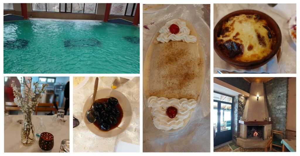 Στα Λουτρα Σμοκόβου είναι κλειστά τη συγκεκριμένη περίοδο, οπότε είχαμε την ευκαιρία να απολαύσουμε μια πριβέ ξενάγηση στους χώρους ενώ φάγαμε στο φιλόξενο μαγαζί «Η παλιά φωλιά», δίπλα στο τζάκι. Πέρα από τις πίτες, που ήταν και εδώ πεντανόστιμες, το τοπικό πιάτο που πρέπει να δοκιμάσετε είναι το μοσχαράκι στο πήλινο με διάφορα τυριά αλλά και τα κεφτεδάκια τυλιγμένα με μελιτζάνες. Εδώ δοκιμάσαμε παραδοσιακά γλυκά: την κοφτή: σαν πουτίγκα με παντεσπάνι (τη βρίσκουμε σε διάφορες παραλλαγές σε όλη τη Θεσσαλία) αλλά αυτό που με ενθουσίασε ήταν το γλυκό του κουταλιού καρυδάκι.