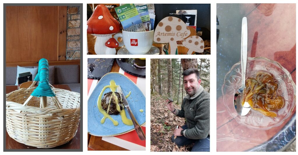 Στα Νεοχώρι, στο καφέ Άρτεμις συναντήσαμε τον Γιώργο Καραντώνη, που έχει μεγάλη αγάπη στα μανιτάρια. Αφού μας ξενάγησε στη γύρω περιοχή από το καφέ του -με τη μοναδική θέα- μας κέρασε γλυκό του κουταλιού μανιτάρι, που συνόδευσε υπέροχα τον καφέ μας. Πολύ πρωτότυπο και γευστικό γλυκό και ενώ δεν είχε κάποιο μυρωδικό -όπως μας είπε- έβγαζε και ένα άρωμα από κανέλα ή γαρύφαλο! Από αγάπη για τα μανιτάρια, ξεκίνησε την έρευνά του εδώ και 10 χρόνια περίπου. Διοργανώνει κυνήγι μανιταριών, ενώ το επόμενο διάστημα σχεδιάζεται να γίνει πάρκο μανιταριών στην ευρύτερη περιοχή. Πού πηγαίνει για να βρει μανιτάρια; Δεν περιορίζεται μόνο στην Καρδίτσα, αλλά πηγαίνει και στα Τρίκαλα -όπου υπάρχει παράδοση στις τρούφες αλλά και μουσείο Μανιταριού- και σε όλη την Ελλάδα! Είδαμε το καλάθι, μέσα στο οποίο γίνεται η συλλογή των μανιταριων ενώ μας έδειξε ενδεικτικά πώς γίνεται η συλλογή. Έχει ένα ειδικό σουγιαδάκι και αφού εντοπίσει το μανιτάρι, το ξεσκεπάζει από το χώμα και το κόβει προσεκτικά με το σουγιαδάκι για να το συλλέξει. Είχαμε την τύχη στη συνέχεια να το δοκιμάσουμε κιόλας! Μας το μαγείρεψε η Ξένια Φηφή, όπου πήγαμε έπειτα για φαγητό. Και ήταν πολύ νόστιμο!