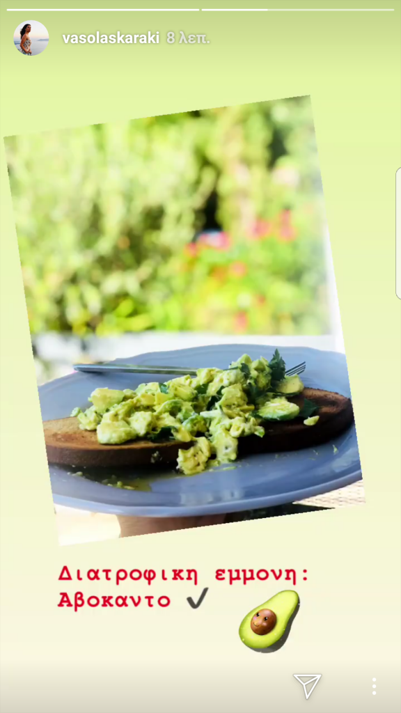 Πρόσφατα, ανέβασε μια φωτογραφία στο Instagram με την οποία μάς αποκάλυψε τη διατροφική της εμμονή, η οποία δεν είναι άλλη από το πεντανόστιμο αβοκάντο. Όπως είδαμε, η Βάσω λατρεύει να το απολαμβάνει με τη μορφή avocado toast. Πιο συγκεκριμένα, λιώνει λίγο αβοκάντο πάνω σε μία φέτα ψωμί και ύστερα προσθέτει ελαιόλαδο, αλάτι και μαϊντανό.