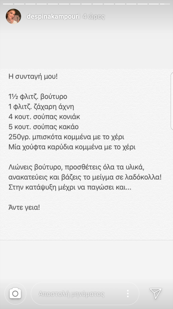Πρόσφατα, όπως μάς έδειξε στα Insta Stories της έφτιαξε το πιο αγαπημένο γλυκό των παιδικών μας χρόνων, το μωσαϊκό. Το λατρεύουν μικροί και μεγάλοι και μπορεί να προετοιμαστεί με υλικά, που συνήθως όλοι έχουμε στα ντουλάπια της κουζίνας και το ψυγείο μας. Είναι επίσης τόσο απλοϊκό στην παρασκευή του, που ενδείκνυται για νέες και άπειρες νοικοκυρές, αλλά και για πολυάσχολους γονείς. Δεν μάς πιστεύετε; Δείτε τη συνταγή ακριβώς έτσι όπως την μοιράστηκε μαζί μας η Δέσποινα: