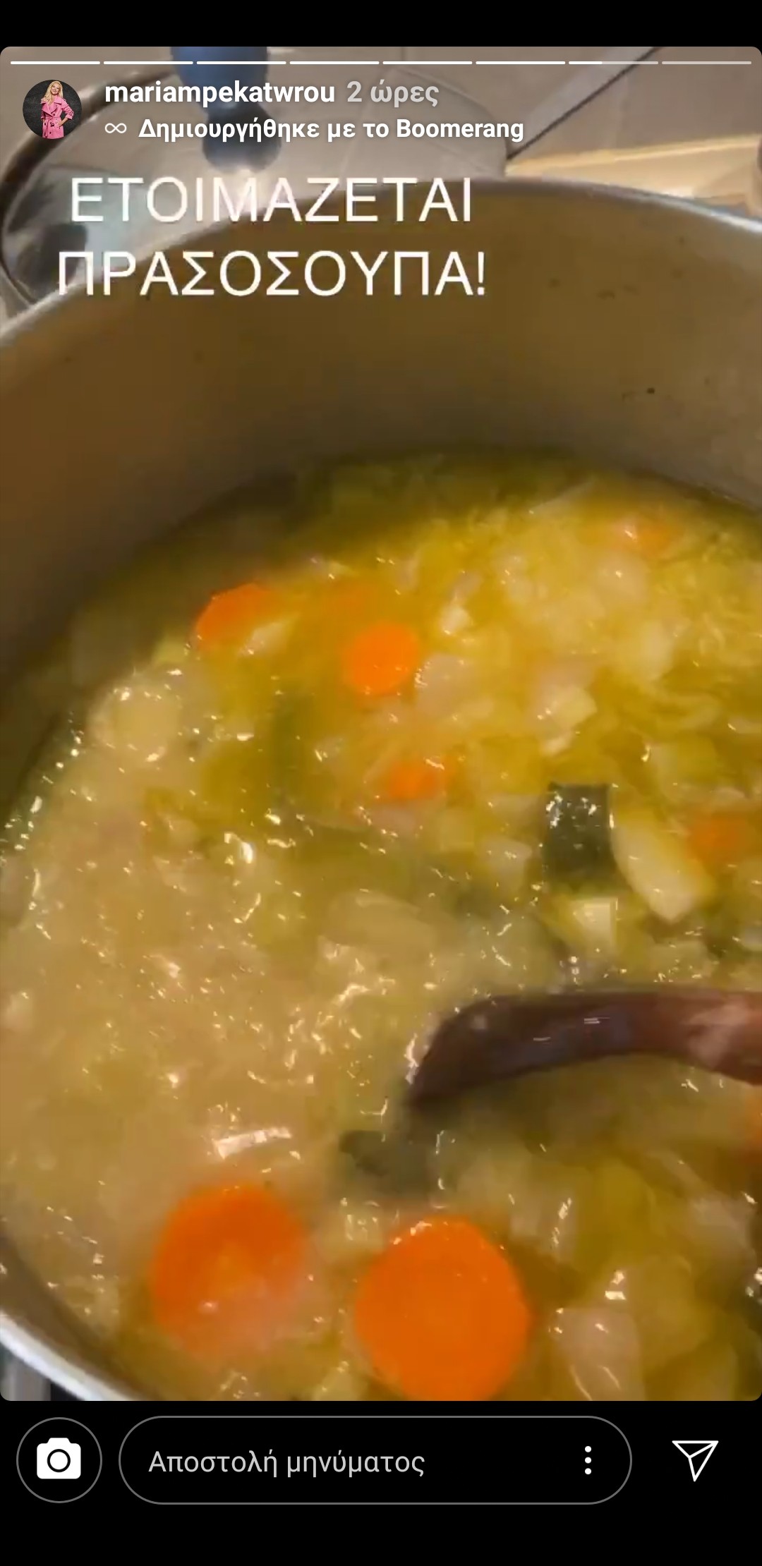 Η παρουσιάστρια πολλές φορές αναφέρεται στο πρόσωπο του συζύγου της -Αντώνη Αλεβιζόπουλου- καθώς του έχει τεράστια αδυναμία. Μάλιστα, πρόσφατα έδειξε μέσω στόρι στο Instagram το φαγητό, που του ετοίμασε, μια πρασόσουπα που φαινόταν ιδιαίτερα νόστιμη και θρεπτική.