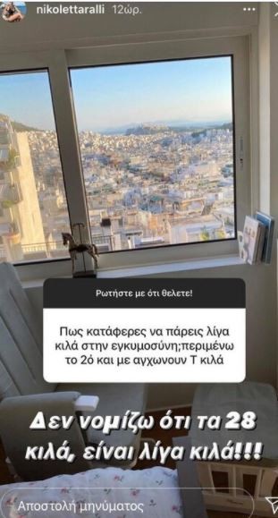Η Νικολέττα Ράλλη τότε απάντησε πως πήρε συνολικά 28 κιλά κατά τη διάρκεια της κυήσεως της, γράφοντας μάλιστα πως δεν τα λες και λίγα. Φυσικά, κρίνοντας από τις φωτογραφίες της, ήδη, πρέπει να έχει χάσει αρκετά. Όπως και να έχει, όμως είναι φυσιολογικό να υπάρξουν κάποια επιπλέον κιλά στην εγκυμοσύνη, που μετά την γέννα, όποτε μια γυναίκα αισθανθεί έτοιμη μπορεί να τα χάσει. Δείτε το σχετικό στιγμιότυπο με την ερώτηση: