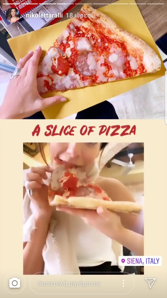 Όπως μάς έδειξε στα Insta stories της, απόλαυσε ένα γιγαντιαίο κομμάτι πίτσας με λεπτή, ιταλική ζύμη, σάλτσα ντομάτας και μοτσαρέλα. Το κομμάτι ήταν τόσο μεγάλο, που με δυσκολία μπορούσε να το πιάσει! Πόσο ζηλεύουμε! Τι λέτε να φάμε και εμείς μία από ΑΥΤΕΣ τις πιτσούλες, που θα φτιάξουμε με τα χεράκια μας;