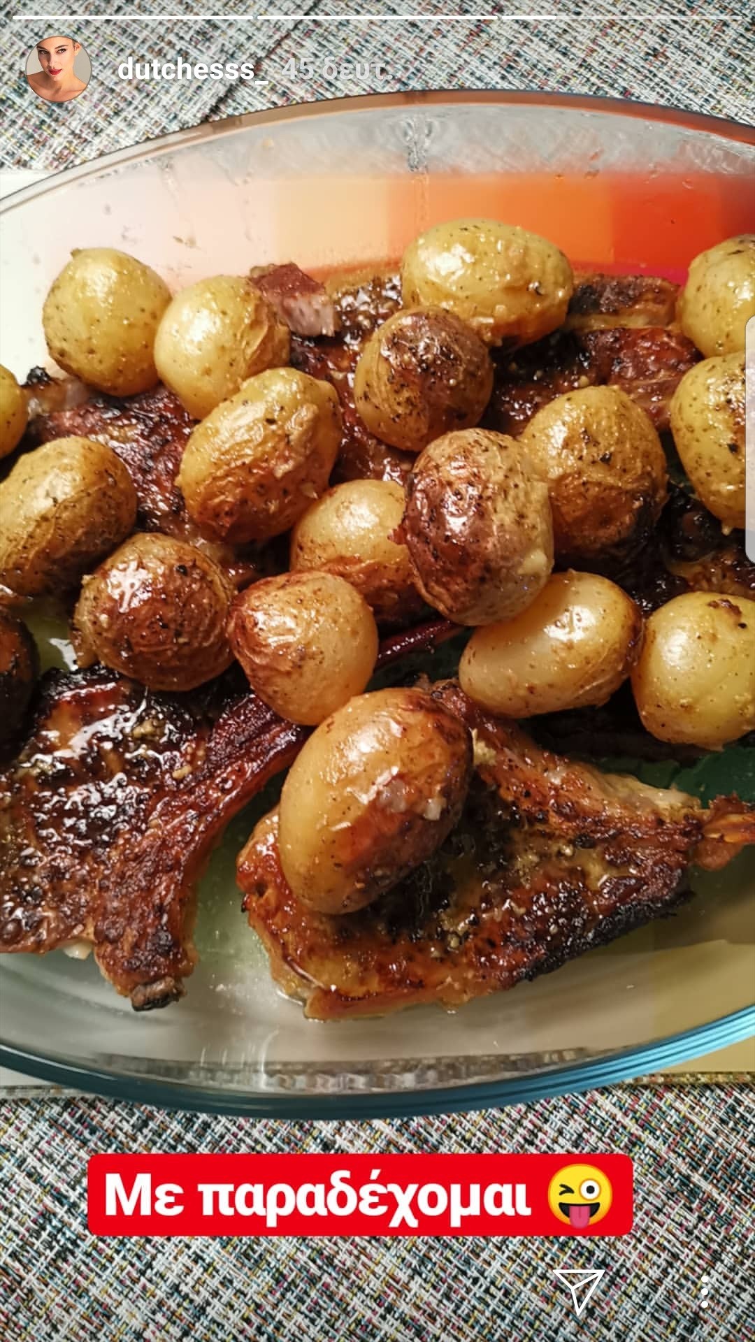 Οι Κυριακές όμως είναι παραδοσιακά ημέρες αφιερωμένες στην οικογένεια και γι’ αυτό η παρουσιάστρια βρήκε χρόνο για να προετοιμάσει ένα άκρως λαχταριστό γεύμα για εκείνη, το σύζυγό της, Δημήτρη Θεοδωρίδη και το μικρό Σάββα. Δεν περιμέναμε ότι έχει τόσο ταλέντο στην κουζίνα μέχρι που είδαμε τη φωτογραφία με τις μπριζόλες και τις baby πατατούλες φούρνου, που μαγείρεψε. «Με παραδέχομαι», έγραψε η ίδια πάνω στο Insta story που ανέβασε φανερά εντυπωσιασμένη από το αποτέλεσμα.
