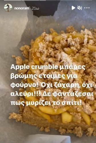 Το αποτέλεσμα φαίνεται πως ενθουσίασε την Ελεονώρα, καθώς όπως έγραψε μετά σε στόρι της: «Αpple crumble μπάρες βρώμης έτοιμες για φούρνο! Όχι ζάχαρη, όχι αλεύρι! Δεν φαντάζεστε πως θα μυρίσει το σπίτι».