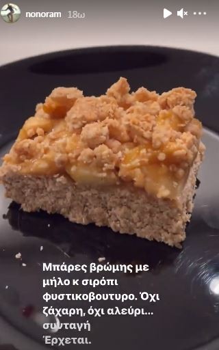 Όπως έγραψε η δημοσιογράφος στη σχετική λεζέντα: «Μπάρες βρώμης με ψημένο μήλο και σάλτσα από φυστικοβούτυρο. Έχει γεύση και υφή flapjack απλά είναι σπιτικό και υγιεινό! Δεν έχει ζάχαρη και δεν έχει αλεύρι! Θα το δοκιμάσουμε κ αν είναι όπως πρέπει, θα δώσω συνταγή!».