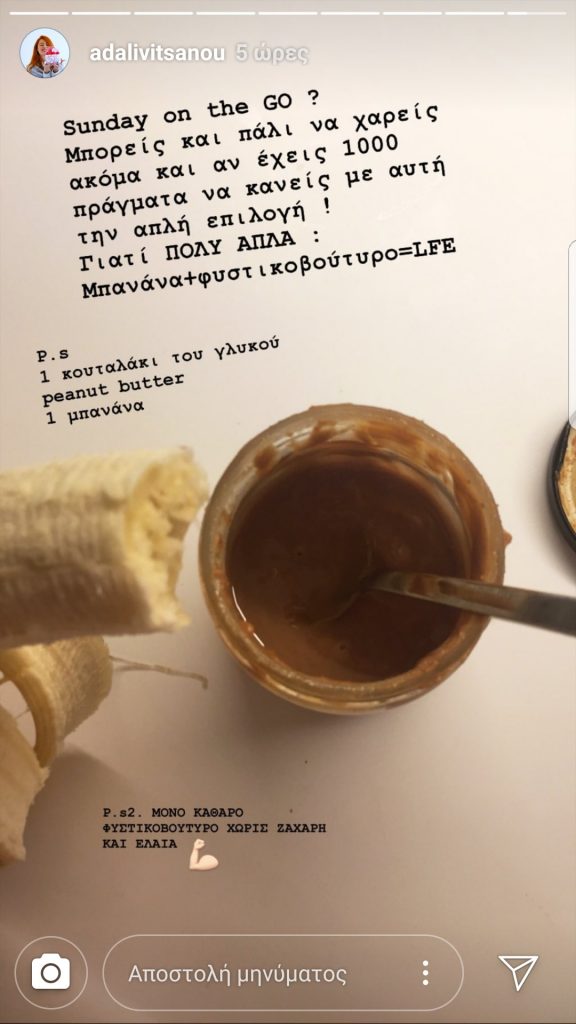 Πρόσφατα μάς έδειξε στα Insta Stories της, το νέο αγαπημένο της γλυκό σνακ και αυτό δεν είναι άλλο από μια μπανάνα με 1 κουτ. γλυκού φυστικοβούτυρο. Είναι νόστιμο, είναι απολαυστικό και άκρως θρεπτικό αφού η μπανάνα περιέχει φυτικές ίνες, κάλιο και βιταμίνες, ενώ το φυστικοβούτυρο καλά λιπαρά και πρωτεΐνη.