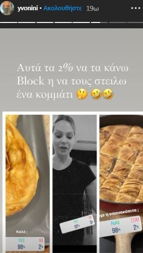 Στην πρώτη φωτογραφία είχε τη «σκοπελίτικη πίτα» ρωτώντας αν φαίνεται καλή, ενώ το δεύτερο ποστ είχε και σπανακόπιτα. Μάλιστα για το 2%, που απάντησε, πως δεν του άρεσε, δεν έχασε το χιούμορ της και εξομολογήθηκε τον τρόπο με τον οποίο θα τιμωρήσει εκείνους που είπαν ότι δεν της πέτυχαν οι πίτες. Δείτε τις σχετικές φωτογραφίες και σου δίνουμε και εμείς 3 σούπερ συνταγές με πίτες.