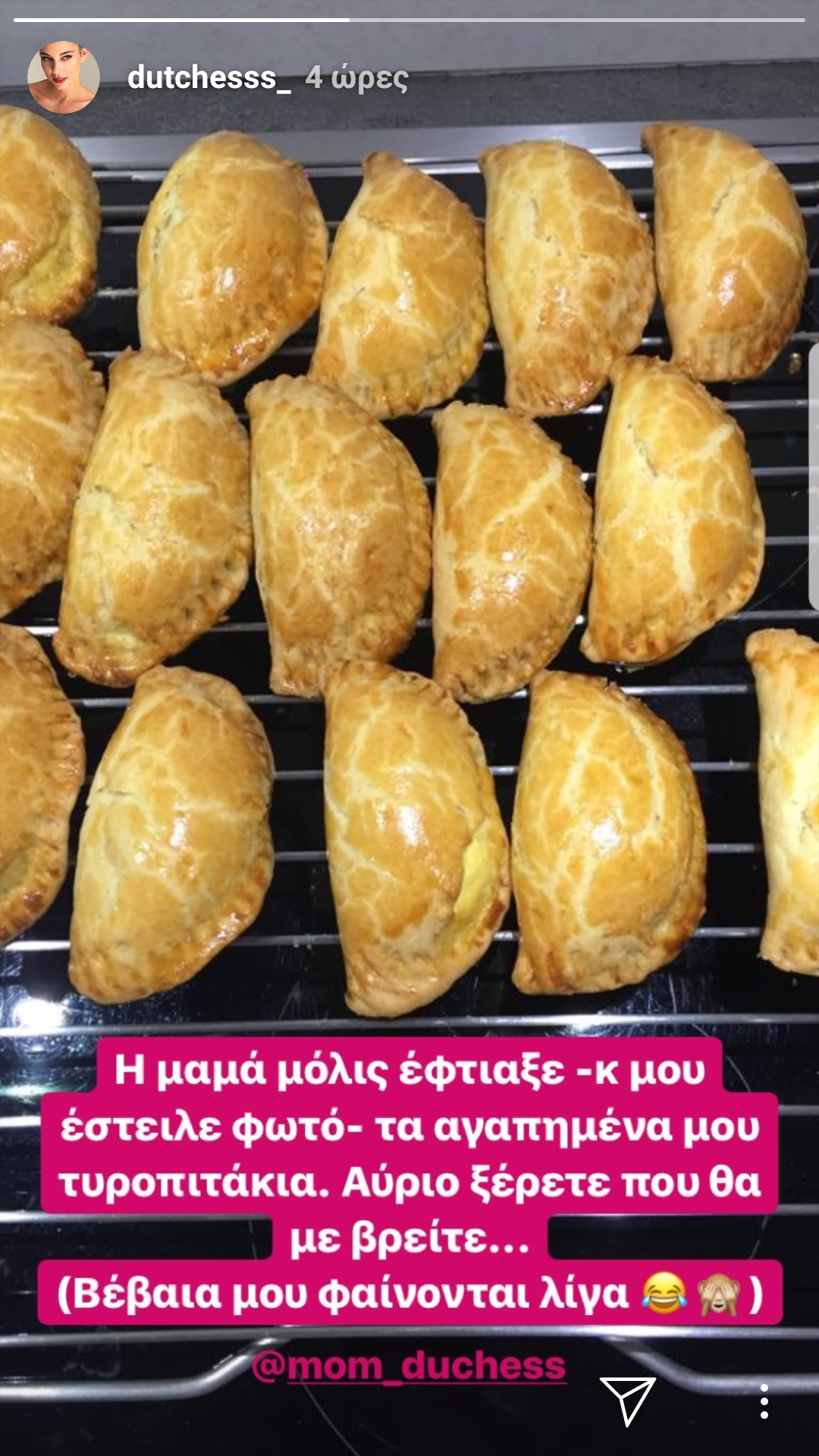 «Η μαμά μόλις έφτιαξε -και μου έστειλε φωτό- τα αγαπημένα μου τυροπιτάκια. Αύριο ξέρετε πού θα με βρείτε… (Βέβαια μού φαίνονται λίγα)», έγραψε πάνω στη φωτογραφία η Δούκισσα, φανερά… πεινασμένη!