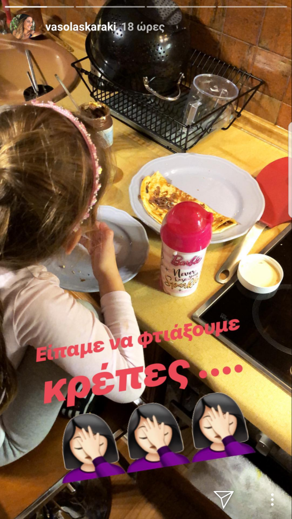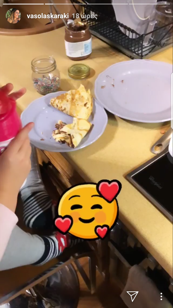 Τα Χριστούγεννα, όπως είχαμε δει στα μέσα κοινωνικής δικτύωσης, είχε φτιάξει με τη βοήθεια του chef πάλι λαχταριστούς κουραμπιέδες. Αυτή τη φορά έφτιαξε πεντανόστιμες κρέπες μαζί με τον σύντροφό της και την κόρη της Εύα. Ο Λευτέρης, όπως είδαμε στα Instagram stories που ανέβασε η ηθοποιός, μάλλον είχε αναλάβει το ψήσιμο, αφού είναι άσσος στο γύρισμα της κρέπας, ενώ η μικρή είχε αναλάβει το γέμισμα με απολαυστική πραλίνα φουντουκιού.