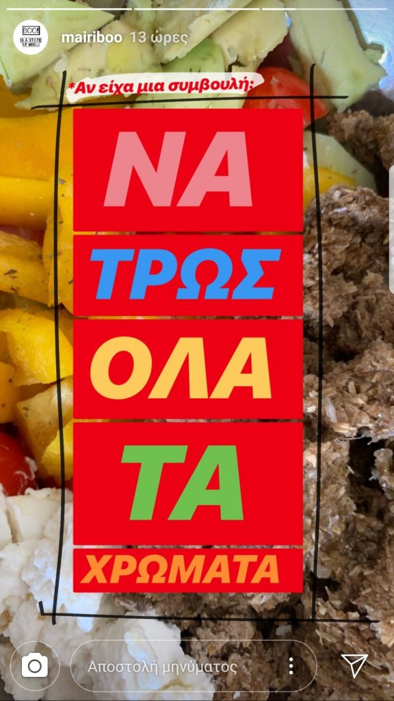 Η Μαίρη Συνατσάκη έχει σίγουρα ένα από τα πιο καλλίγραμμα σώματα της ελληνικής showbiz. Αν είναι λοιπόν να συμβουλευτούμε κάποιον διάσημο, ας είναι η Μαίρη. «Αν είχα μια συμβουλή: Να τρως όλα τα χρώματα», έγραψε στη φωτογραφία που ανέβασε στα Insta Stories της. Τι εννοεί όμως;