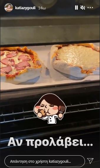 Η Κάτια έβγαλε δύο βίντεο, στο ένα που άνοιγε τη ζύμη της πίτσας και στο άλλο που τις έψηνε. Η αλήθεια είναι πως φαίνονται ιδιαίτερα λαχταριστές… Ίσως και γι’ αυτό να έγραψε η Κάτια στο τέλος «αν προλάβει…».