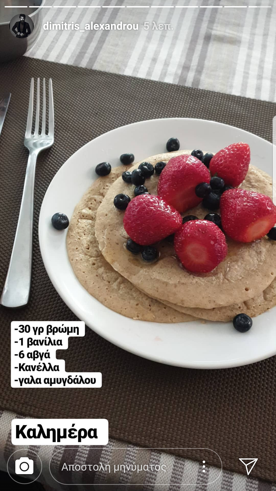 Βάζει στο μπλέντερ του 30γρ. βρώμη, βανίλια, 6 αβγά, κανέλα και λίγο γάλα αμυγδάλου. Έπειτα παίρνει κουταλιές από το μίγμα και ψήνει τα pancakes στο τηγάνι. Σερβίρει με φρέσκα φρούτα, όπως φράουλες και μύρτιλλα. Το συγκεκριμένο πρωινό περιέχει μεγάλη ποσότητα πρωτεΐνης χάρη στα αβγά και τη βρώμη, γεγονός που το κάνει το τέλειο γεύμα για κάποιον σαν τον Δημήτρη που γυμνάζεται πολύ και θέλει να διατηρήσει τους μύες του.