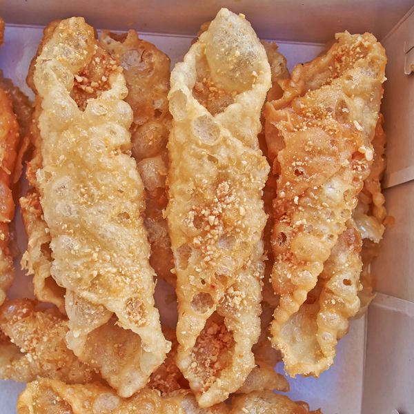 Για το τηγάνισμα, θα χρειαστούμε ένα βαθύ και μεγάλο τηγάνι, με μπόλικο ελαιόλαδο. Η φωτιά μας θα πρέπει να είναι δυνατή, αλλά να μην καπνίζει το λάδι. Κόβουμε τα φύλλα της ζύμης, τετράγωνα κομμάτια 8Χ8cm περίπου ή λωρίδες και τα ψήνουμε, διπλώνοντάς τα σε διάφορα σχήματα.