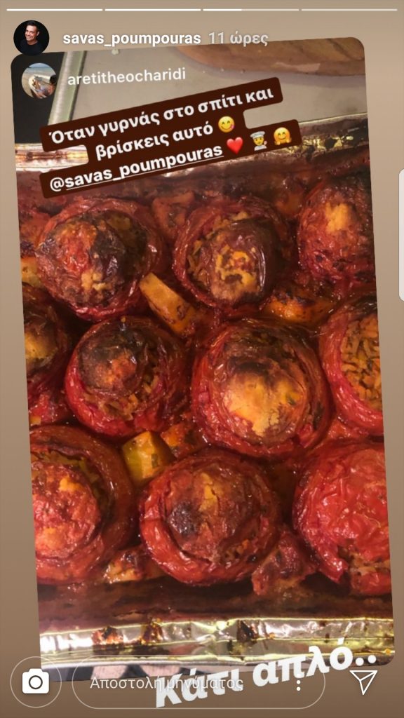 Πρόσφατα, όπως είδαμε στο Instagram έψησε ένα ταψί γεμιστές ντομάτες, που κρίνοντας από τη φωτογραφία, είχαν μελώσει μοναδικά, ακριβώς όπως εκείνες που φτιάχνουν οι παλιές παραδοσιακές νοικοκυρές. «Όταν γυρνάς στο σπίτι και βρίσκεις αυτό», έγραψε η σύζυγος του παρουσιαστή, Αρετή Θεοχαρίδη πάνω στη φωτογραφία που ανέβασε στα Insta Stroies, εκφράζοντας την ευγνωμοσύνη της για τον σύζυγό της.