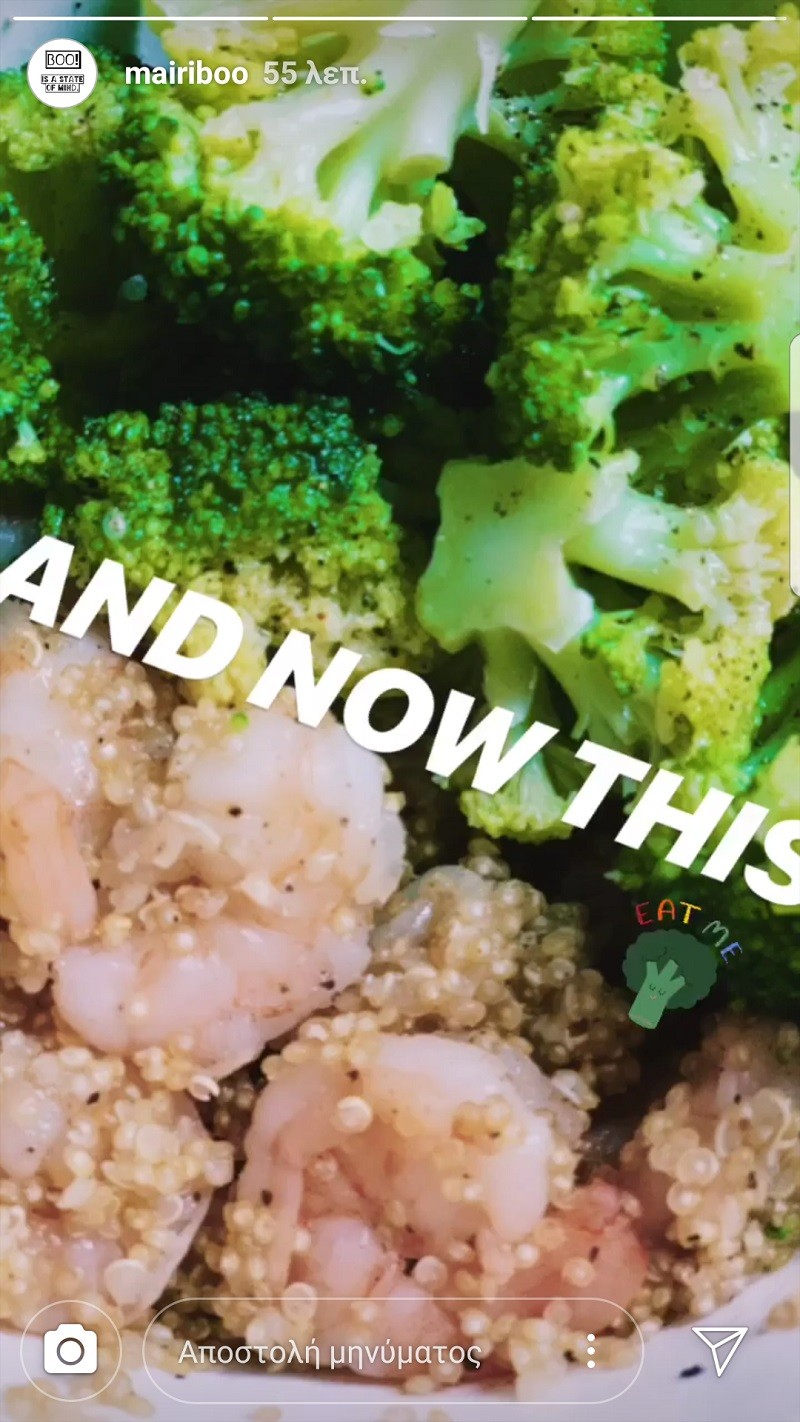 Όπως μας έχει δείξει συχνά στα Insta stories της, η Μαίρη προτιμά να συνδυάζει ένα σούπερ θρεπτικό μπολ με πρωτεϊνη -εδώ συγκεκριμένα συνδύασε γαρίδες με κινόα και μπόλικο μπρόκολο. Το συγκεκριμένο γεύμα περιέχει μεγάλη ποσότητα πρωτεΐνης από την κινόα, τα θαλασσινά και τα λαχανικά, ενώ είναι πλούσιο σε φυτικές ίνες, μέταλλα και βιταμίνες.