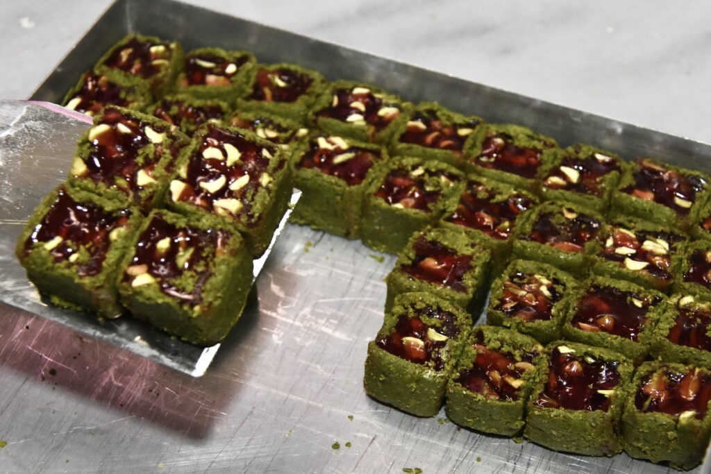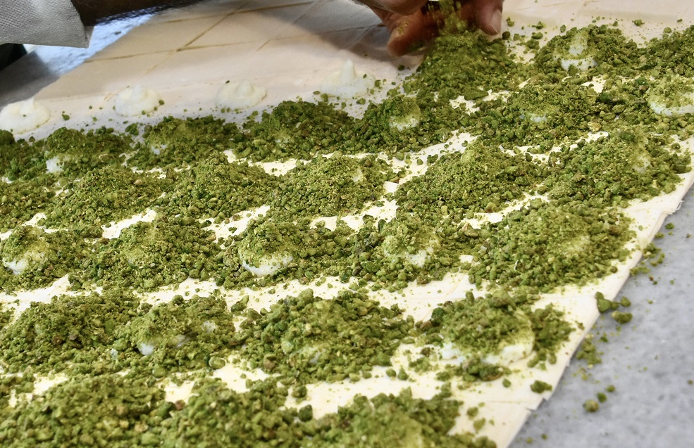 Μεθυστικά αρώματα πλημμύριζαν το εργαστήριο, ενώ το πράσινο του φιστικιού κυριαρχούσε στον χώρο. Μπακλαβάδες, φιστίκια, κανταΐφια, καζάν ντιπί και άλλα ανατολίτικα γλυκά, όλα μαζί, συνέθεταν μία απολαυστική εικόνα.