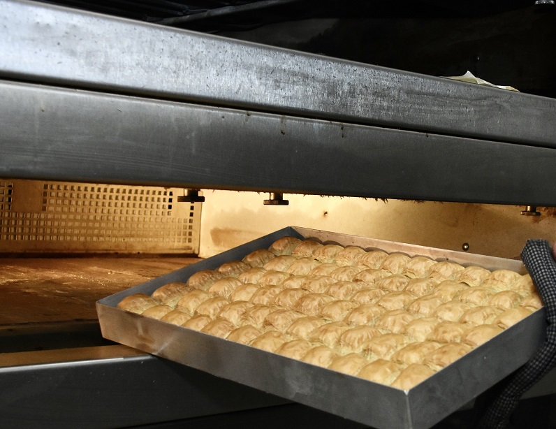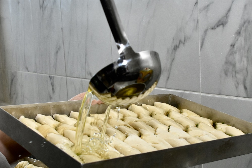 Τα ταψιά έβγαιναν το ένα μετά το άλλο, ενώ ήμασταν μπροστά και στο σιρόπιασμα, που είχε το δικό του χαρακτηριστικό ήχο καθώς το σιρόπι έπεφτε στα τραγανά φύλλα. Ζήτησα από τον μάστορα -που όπως είπε κάνει αυτή τη δουλειά από παιδί- άρα τουλάχιστον σαράντα χρόνια- να μου πει κάποια από τα μυστικά ενός καλού μπακλαβά (όσα φυσικά θα μπορούσε να μοιραστεί). Όπως είπε: «Από τα σημαντικότερα είναι να έχεις δύναμη στα χέρια, το φύλλο πρέπει να είναι ψιλό. Εδώ φτιάχνουμε τον μπακλαβά όπως τον μάθαμε από παιδιά. Ανοίγουμε πολύ λεπτά φύλλα. Επίσης, χρειάζεται προσοχή στο βούτυρο, έχει πολύ μεγάλη σημασία, η σωστή θερμοκρασία. Φυσικά, δε μπορεί να χρησιμοποιηθεί οποιοδήποτε βούτυρο σε έναν μπακλαβά, δε θα δώσει το σωστό αποτέλεσμα εάν δεν είναι το κατάλληλο. Εδώ, επίσης χρησιμοποιούμε φιστίκι Αντέπ που έχει πιο έντονη γεύση και αποτελεί βασικό χαρακτηριστικό του μπακλαβά μας».