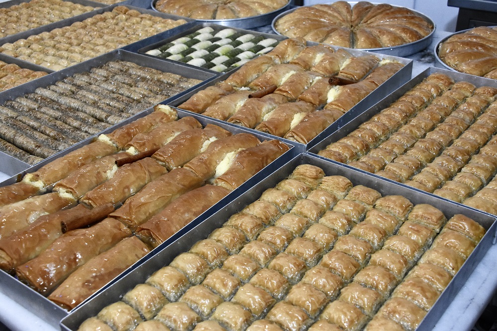Στο εργαστήριο δεν υπάρχουν μόνο οι κλασικοί μπακλαβάδες, αλλά μύδια, σαρμά φιστίκι μπακλαβά, σομπιέτ, λουκούμια, γαλακτομπούρεκο, αλλά και κανταΐφια, όπου τα «μαλλιά» τα ετοιμάζουν παραδοσιακά μέσα στο εργαστήριο. Φυσικά, υπάρχει και το περίφημο καζάν ντιπί που σημαίνει ο πάτος του καζανιού και που πραγματικά ήταν ελαφρύ και αέρινο.