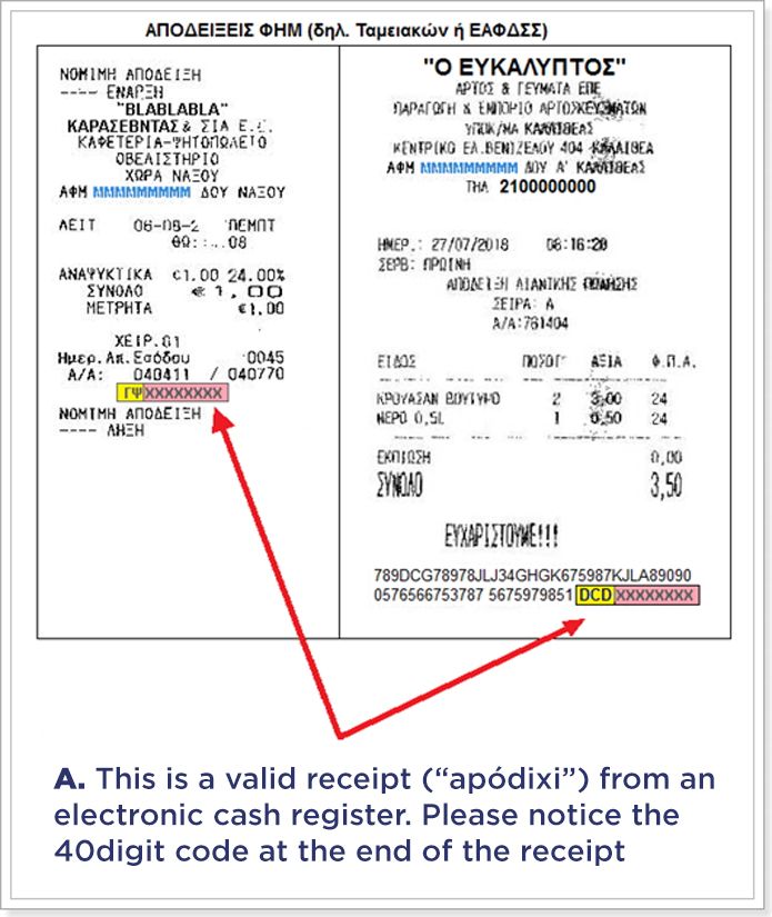 Furthermore, all suppliers of goods and services are obliged to issue receipts to their customers. Consumer is not obliged to pay, in cash or by card, if he/she is not provided with a valid payment receipt (“apódixi”).