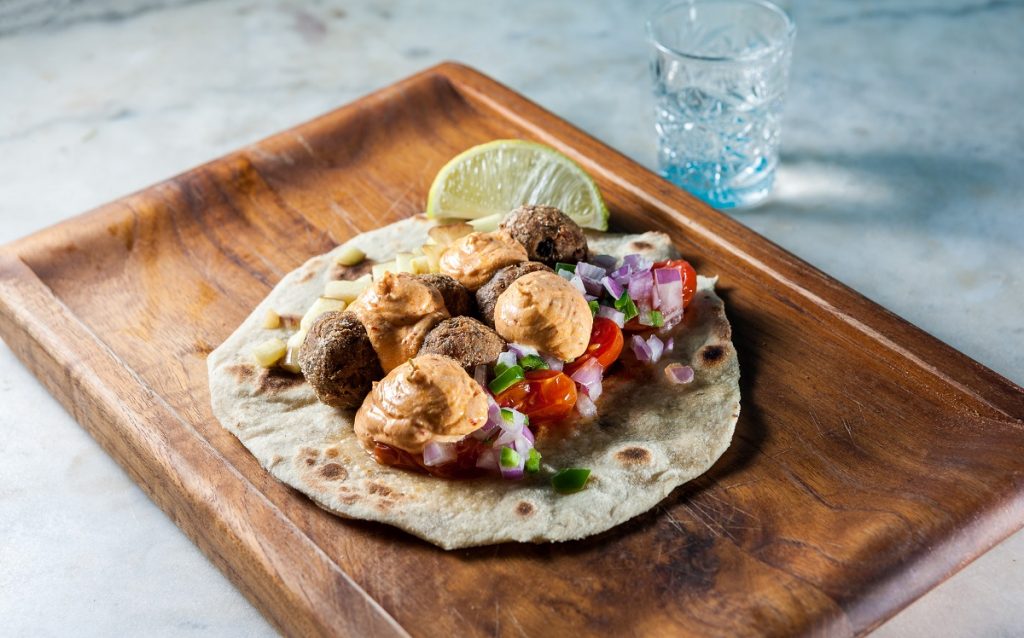 Τάκος από χοιρινά κεφτεδάκια με σάλτσα καπνιστής γαλομυζήθρας