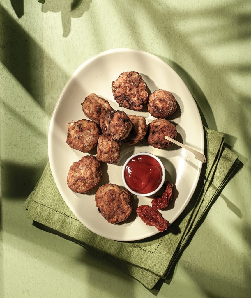 Κεφτεδάκια κοτόπουλου με λιαστή ντομάτα και φέτα