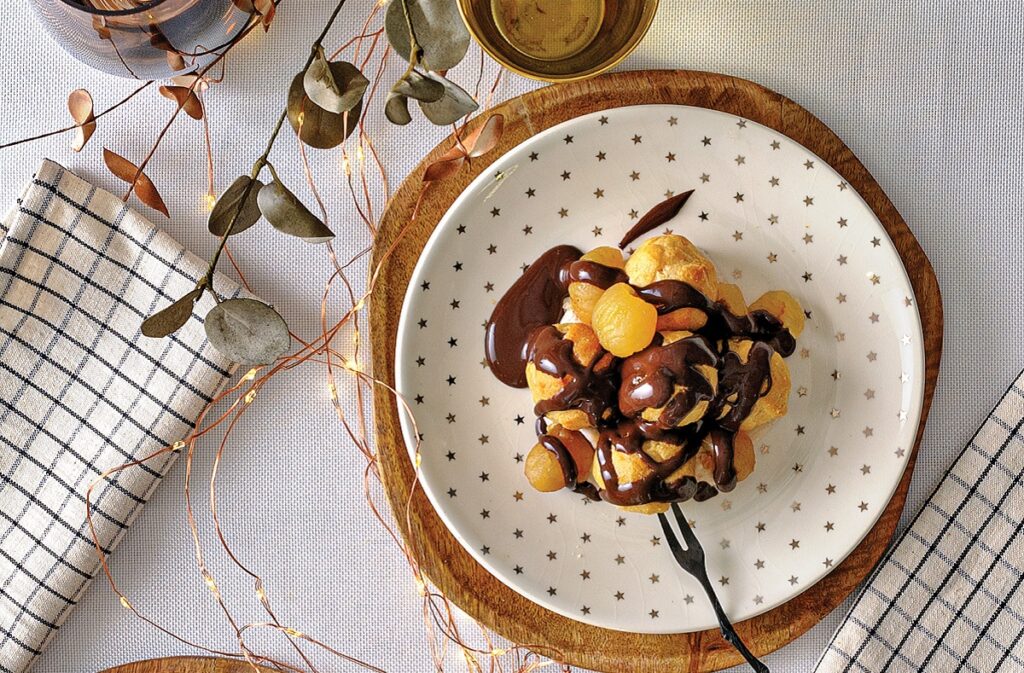 Για τους λάτρεις του κάστανου, αυτό το προφιτερόλ με την κρέμα του αγαπημένου χειμερινού καρπού και τη σάλτσα σοκολάτας. Φτιάξτε το και θα γίνει ανάρπαστο!