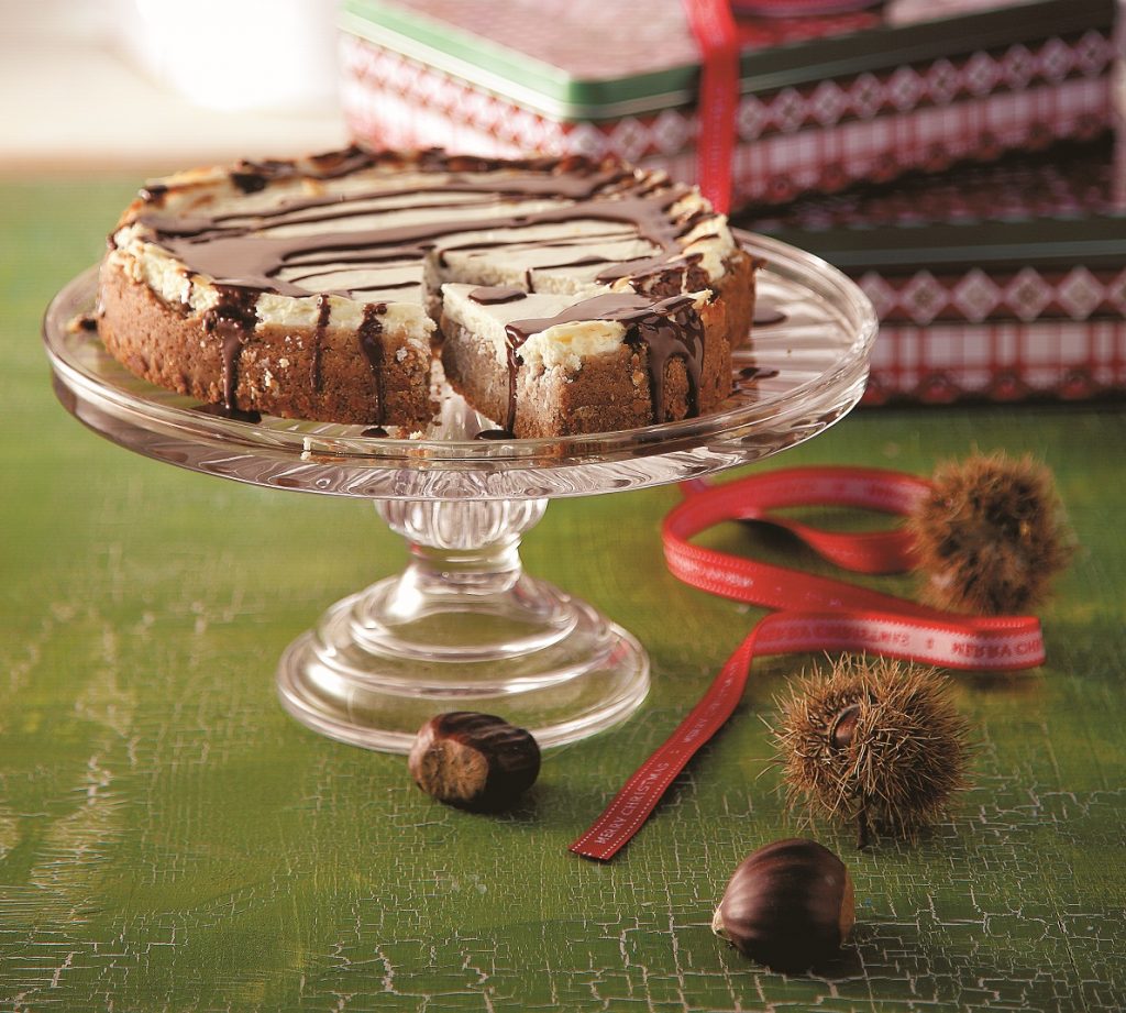 Cheesecake με πουρέ κάστανο στο φούρνο και σιρόπι σοκολάτας
