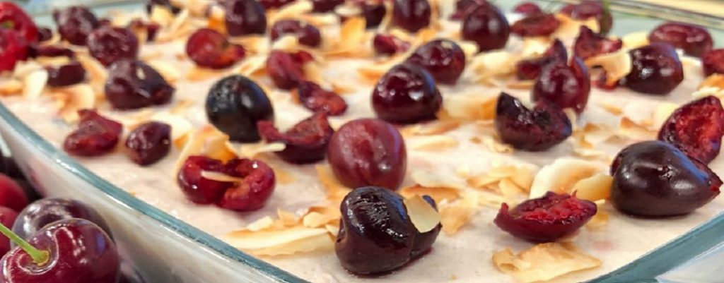 Καλοκαιρινό γιαουρτογλυκό με ψητά κεράσια και καρύδα