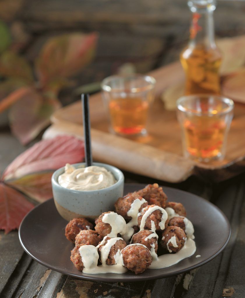 Χοιρινά κεφτεδάκια με σάλτσα κοπανιστής και τσίπουρο με σαφράν