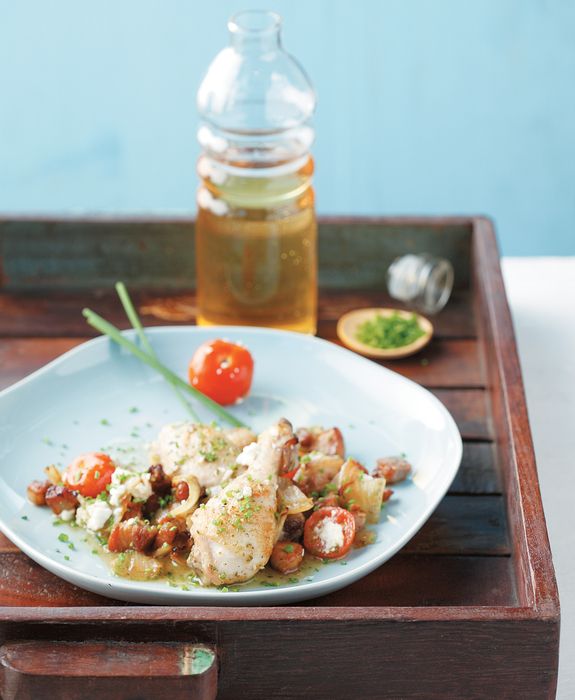 Κοτόπουλο γλυκόξινο με φέτα και ντοματίνια. Η γλυκόξινη γεύση πάει πολύ στο κοτόπουλο και το μηλόξιδο με το μέλι δημιουργούν μία υπέροχη σάλτσα. Για μια πιο παραδοσιακή νότα προσθέτουμε ντοματίνια, ρίγανη και φέτα, ενώ η πανσέτα δίνει έξτρα γεύση στο πιάτο.