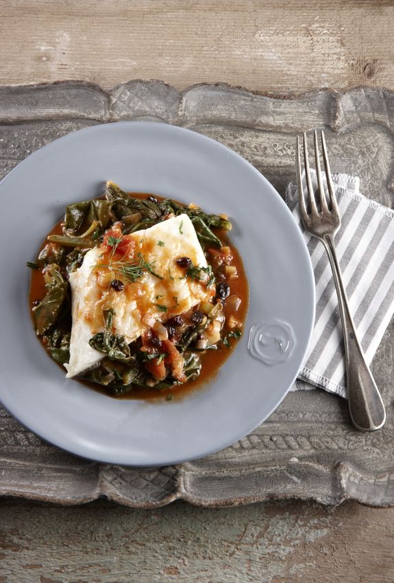 Μιας και οι δύο εβδομάδες που ακολουθούν θα έχουν πολύ κρέας στο μενού τους, για αυτό το κυριακάτικο τραπέζι επιλέγουμε μπακαλιάρο μαγειρεμένο με χόρτα και σταφίδες.