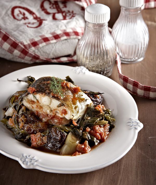 Το κυριακάτικο τραπέζι έχει γεύση από θάλασσα, με μπακαλιάρο ψημένο στη γάστρα με γλυκά χόρτα εποχής αλλά και ξερά δαμάσκηνα.