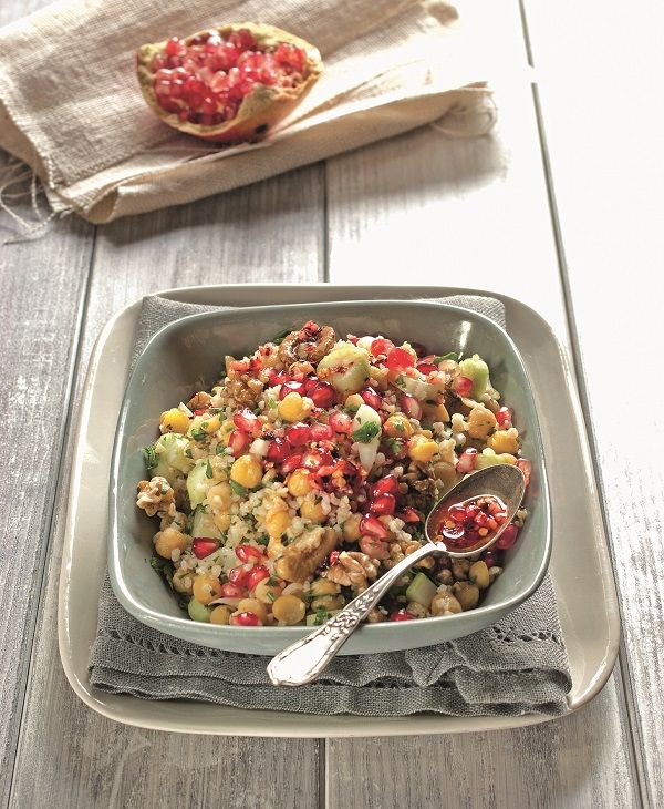 και σαλάτα με πλιγούρι, σέλερι, ρεβίθια, καρύδια και ρόδια.
