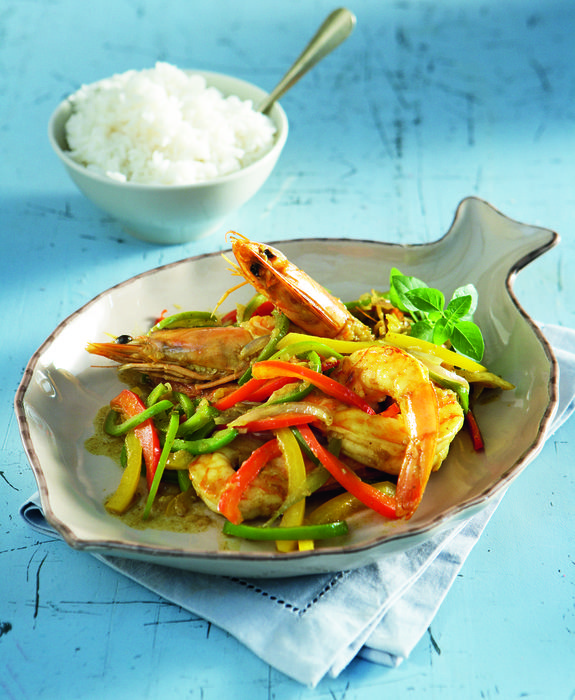 Το μενού της Πέμπτης έχει γαρίδες μαγειρεμένες με πιπεριές και κάρι, που γαρνίρουμε με αρωματικό ρύζι basmati.
