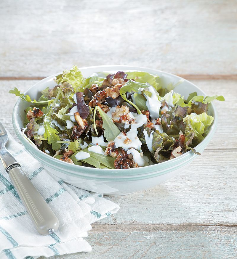 παρέα με πράσινη σαλάτα με καραμελωμένα καρύδια και σάλτσα μπλε τυριού.
